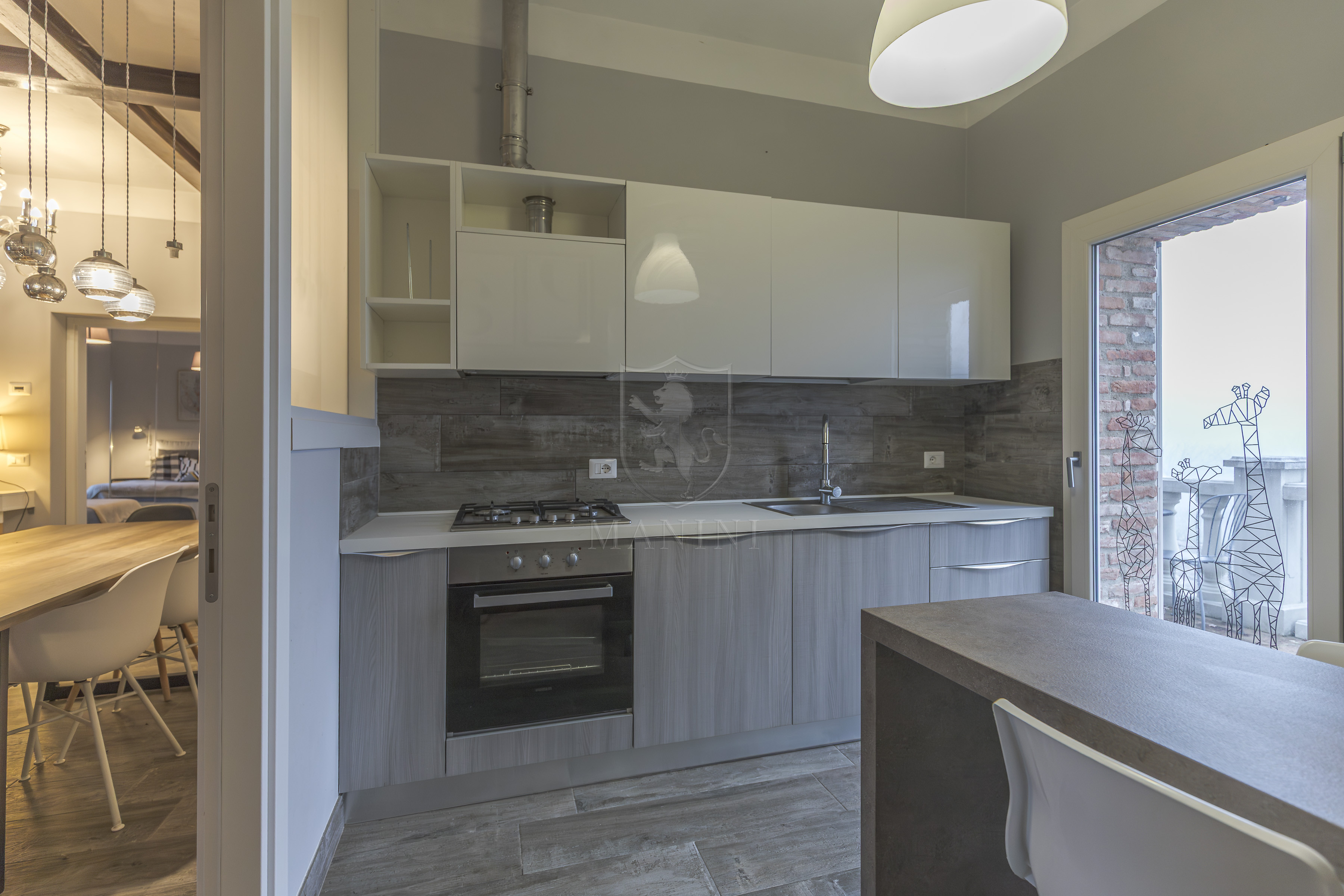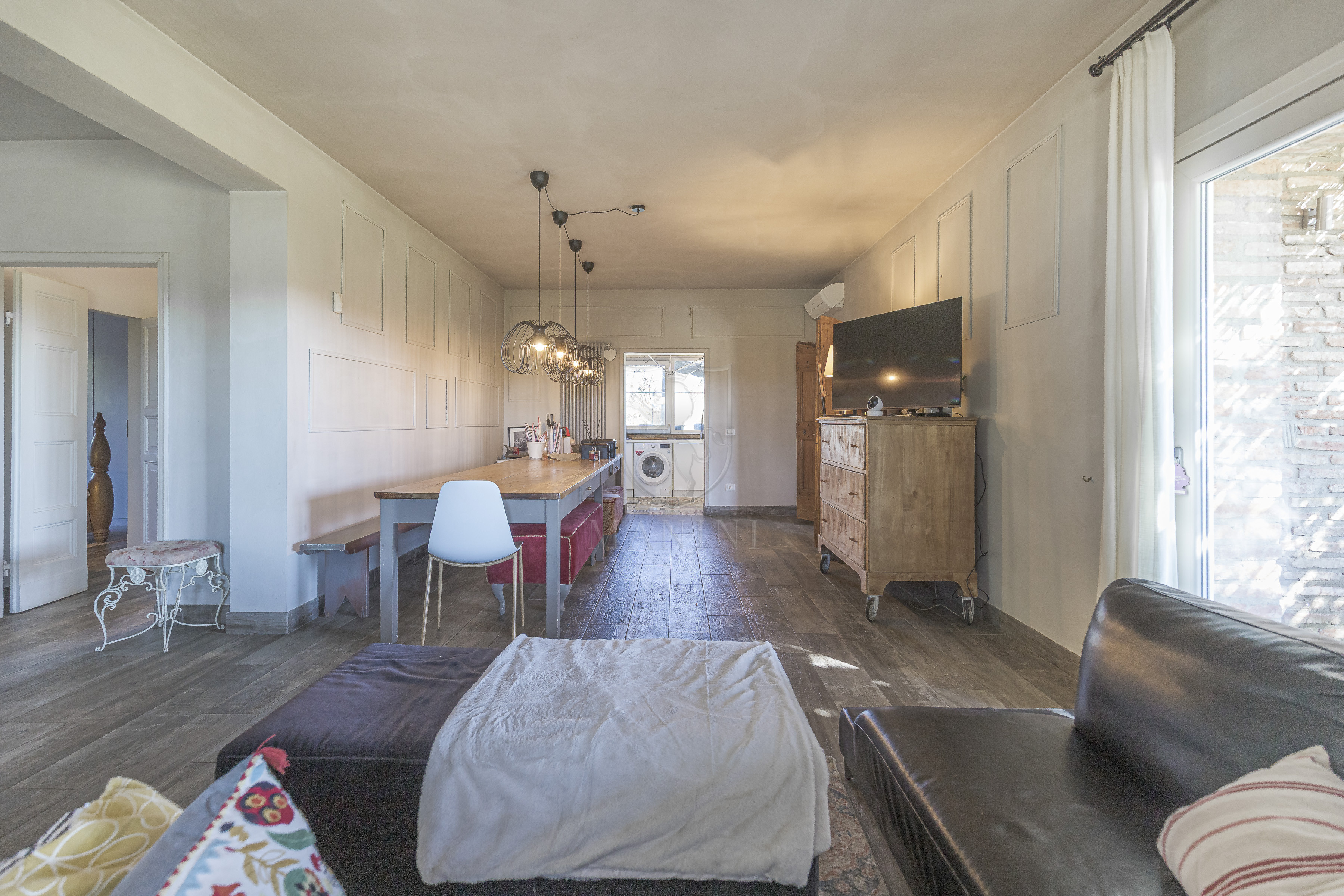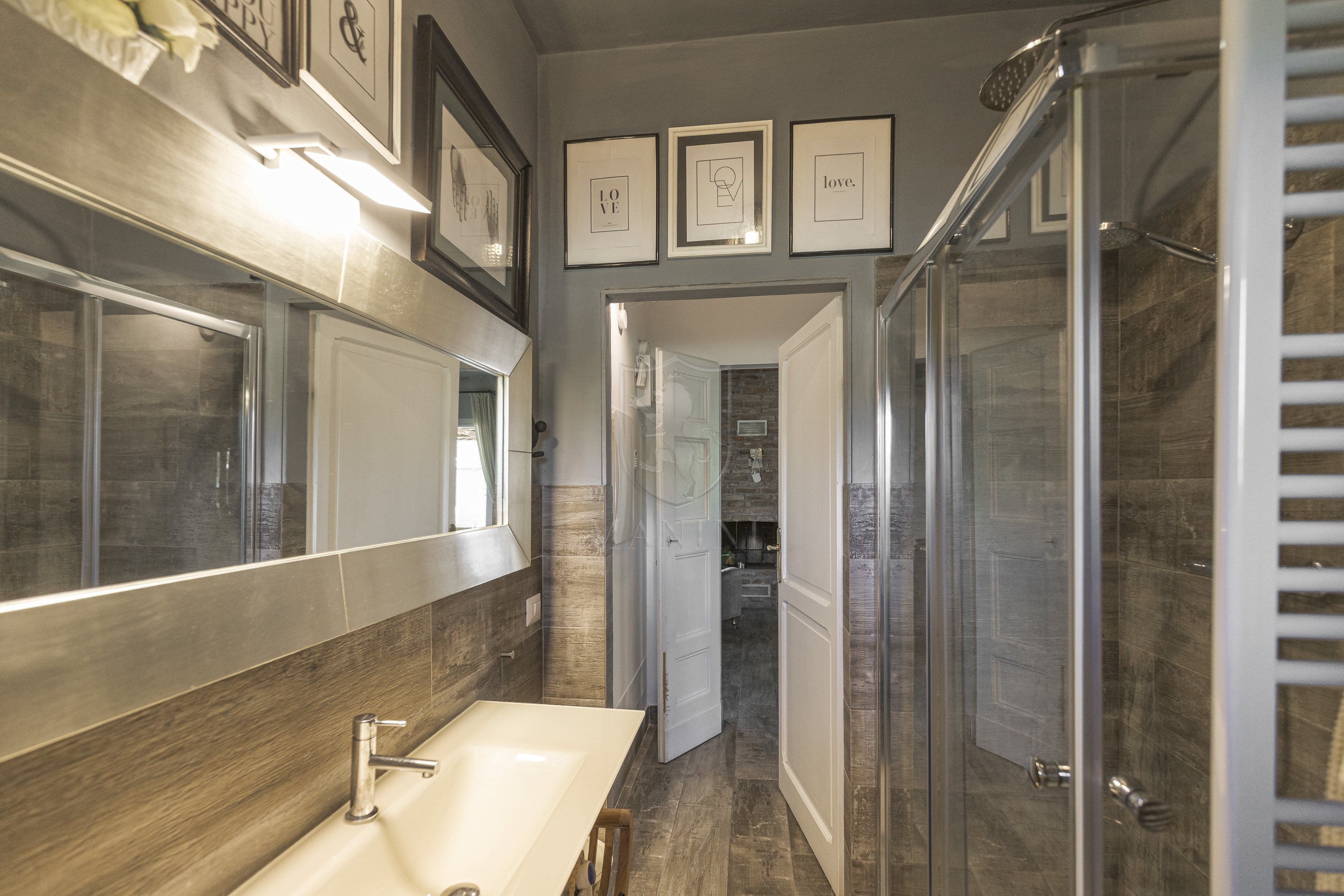 The upper floor, accessible via an external staircase, features a large living room, two bedrooms, a bathroom, and a panoramic terrace overlooking the Valdichiana hills. It's an ideal space as a separate guest apartment or as a second unit for high-quality vacation rentals.