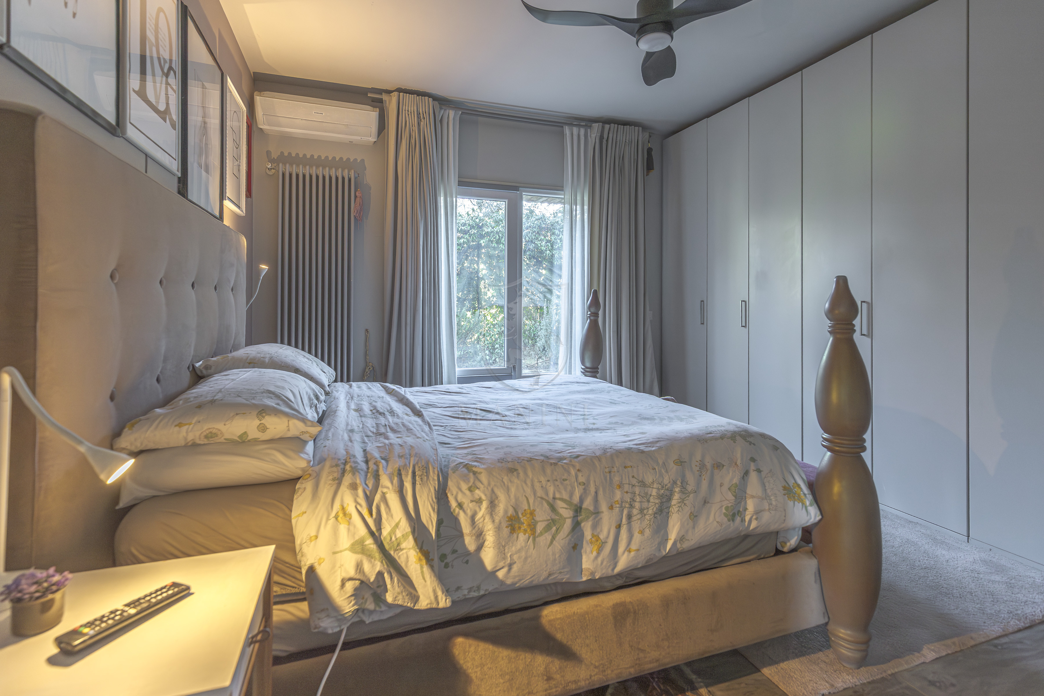 On the ground floor, the living room opens onto the outdoor pergolas, creating a natural connection between the interior and exterior. The open-plan kitchen connects with the dining area and relaxation areas overlooking the greenery. The sleeping area includes two double bedrooms and two bathrooms, one ensuite. A fireplace enhances the atmosphere and enhances the home's character.