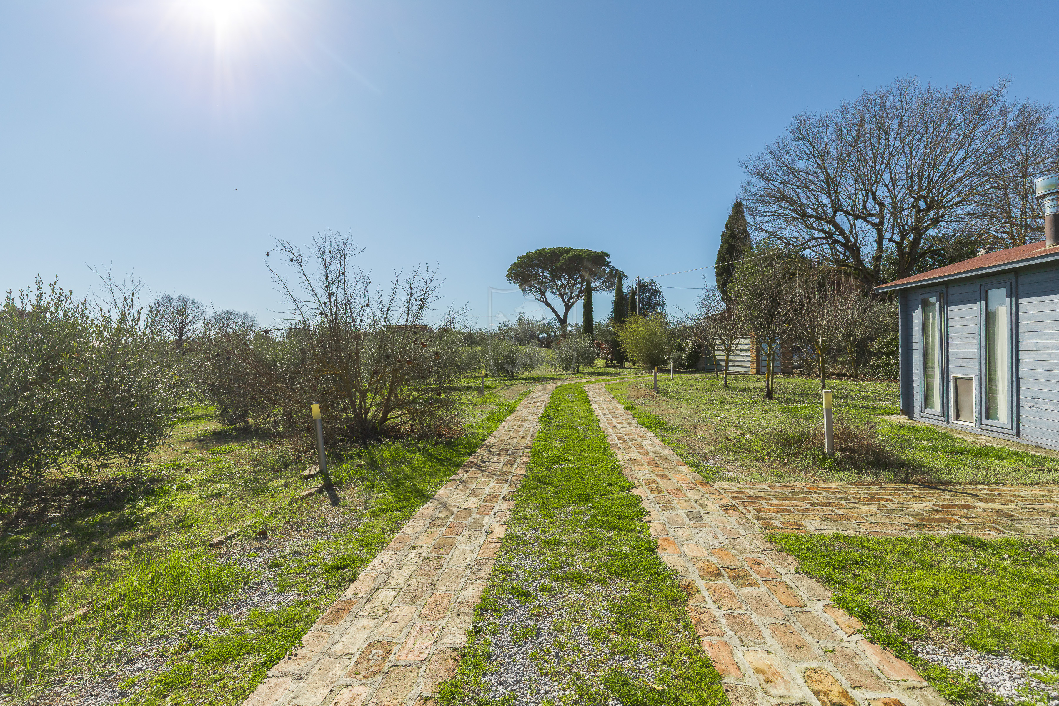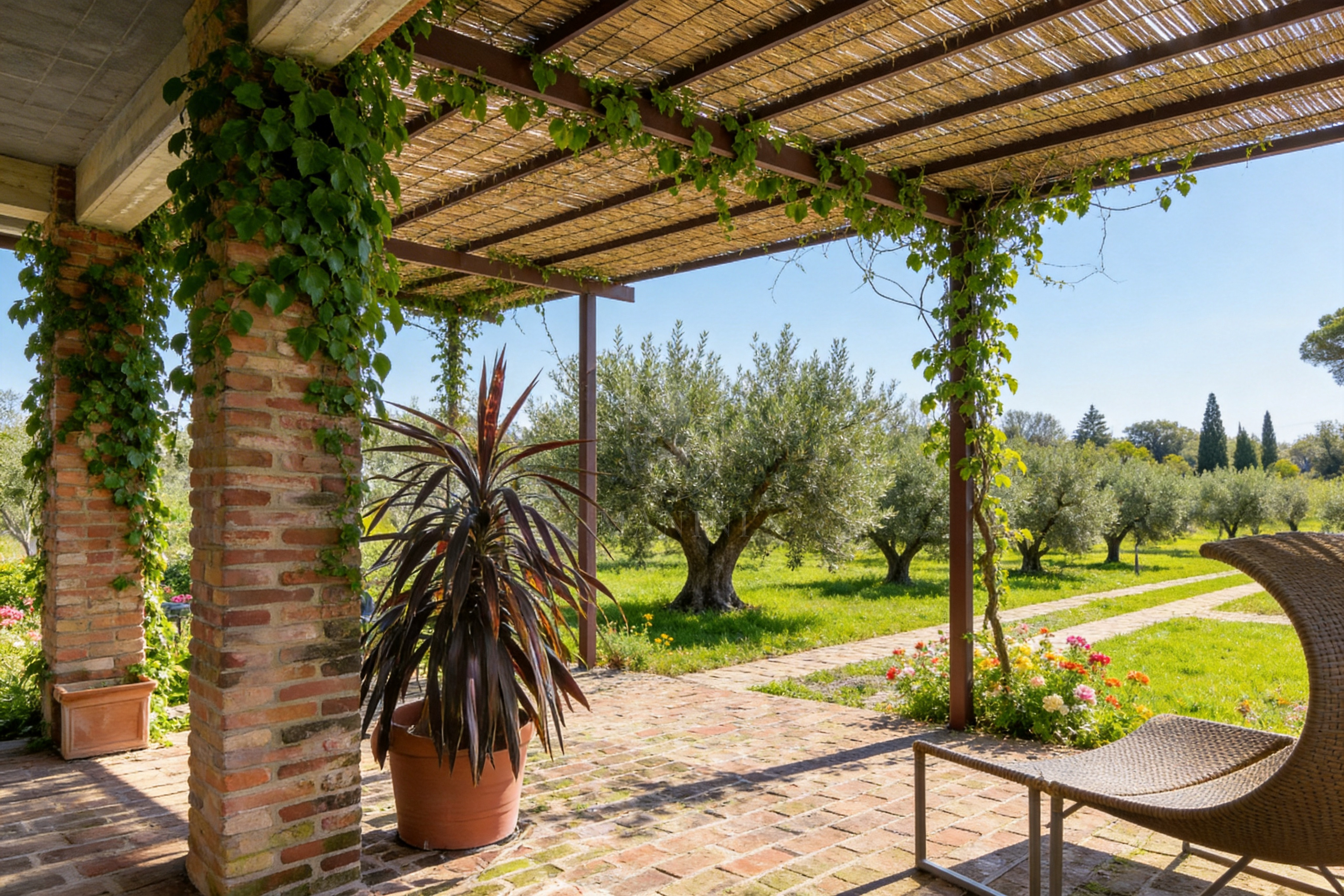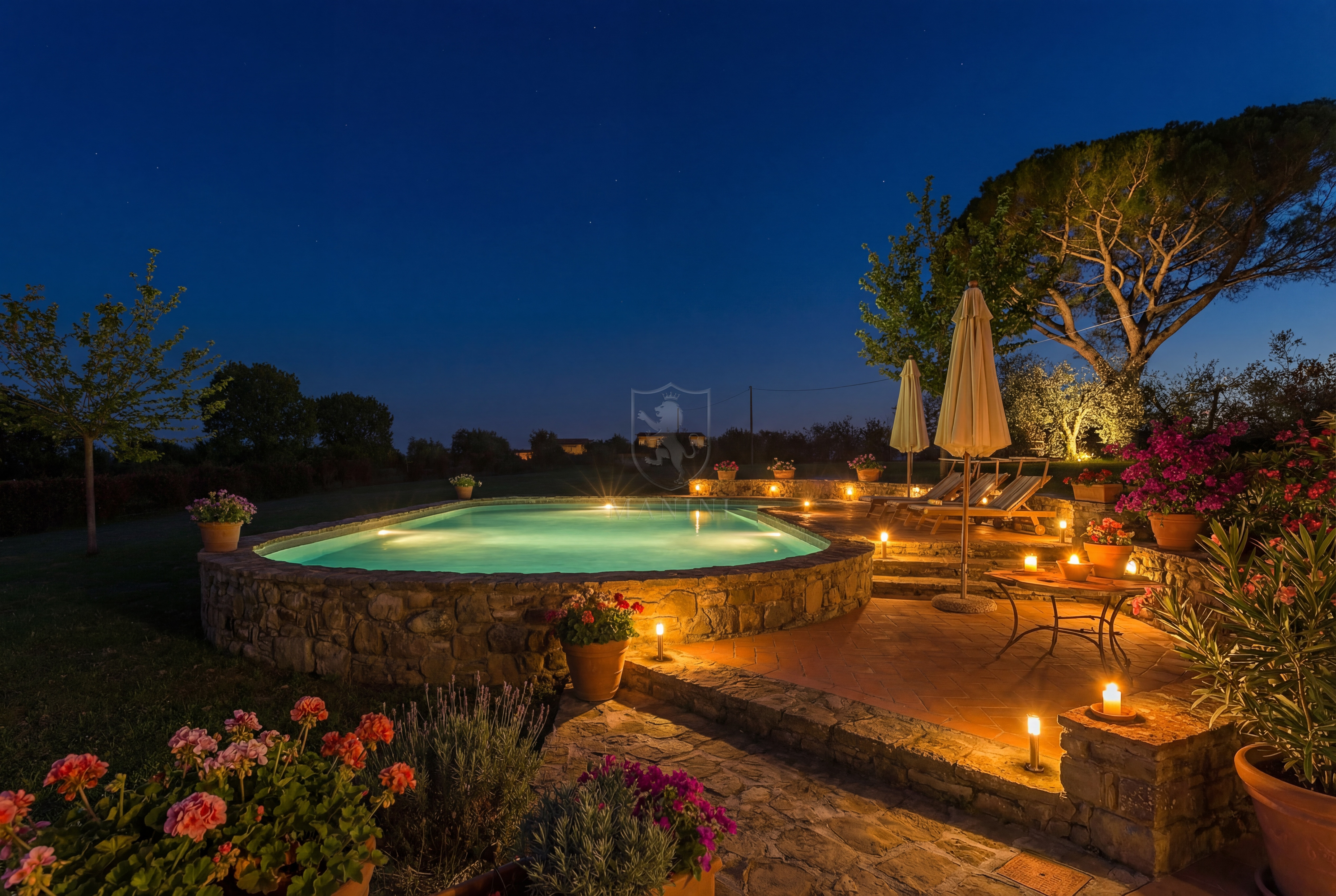 Outside, the fully fenced private park of approximately 7,000 m² offers spacious green spaces, olive trees, and Mediterranean plants that ensure privacy. The pergolas become true living spaces: summer dinners, moments of relaxation, and conviviality. It's possible to build a panoramic swimming pool in Tuscany, integrated into the landscape and coherent with the rural setting.